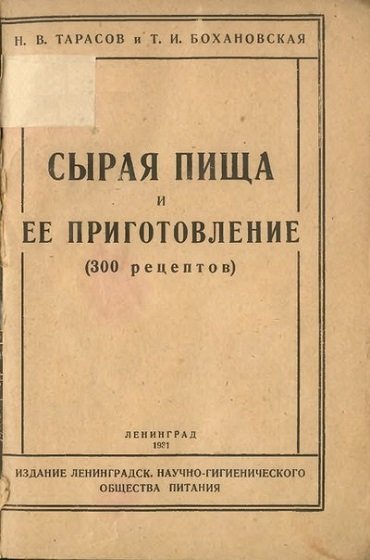 Уникальная книга, написанная советскими врачами Тарасовым и Бохановской и изданная в 1931 году, посвящена практике и опыту сыроедения. Книга включает в себя исторический обзор сыроедения, очерки о его идейных вдохновителях, подробный обзор сыроедения как образа жизни с точки зрения врачебной науки, а также сборник 300 рецептов блюд из сырых продуктов.